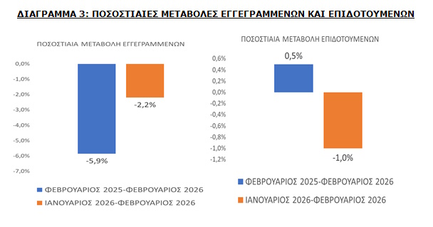 Στον πίνακα 2 παρουσιάζονται οι μεταβολές των εγγεγραμμένων και των επιδοτούμενων από τον αντίστοιχο μήνα του προηγούμενου έτους Φεβρουάριο 2025 καθώς και από τον προηγούμενο μήνα Ιανουάριο 2026.