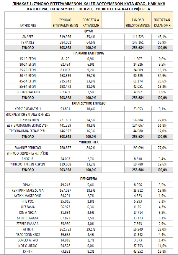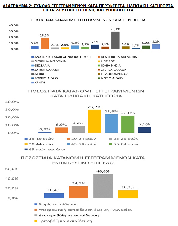 Μεταξύ των Περιφερειών της Χώρας η Περιφέρεια Αττικής και η Περιφέρεια Κεντρικής Μακεδονίας καταγράφουν τον μεγαλύτερο αριθμό εγγεγραμμένων ο οποίος ανέρχεται σε 262.783 άτομα (ποσοστό 29,1%) και 167.037 άτομα (ποσοστό 18,5%) αντίστοιχα.