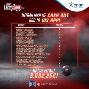 Ένας μεγάλος νικητής στο Pamestoixima.gr κατάφερε χρησιμοποιώντας το Cash Out από το iOS App του Pamestoixima.gr να κερδίσει 3.032,25 ευρώ έχοντας παίξει 14 επιλογές τελικού αποτελέσματος από το ποδόσφαιρο, το μπάσκετ και το τένις.