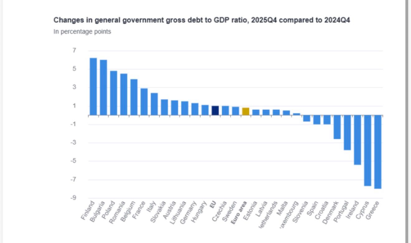 Η μοναδική χώρα της ΕΕ που πέτυχε κάτι εφάμιλλο με την Ελλάδα είναι η Κύπρος, η οποία μεταξύ 2021 και 2025 κατάφερε να βελτιώσει τον λόγο του ΑΕΠ προς το δημόσιο χρέος κατά 62,5 μονάδες.