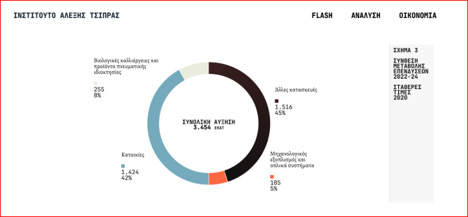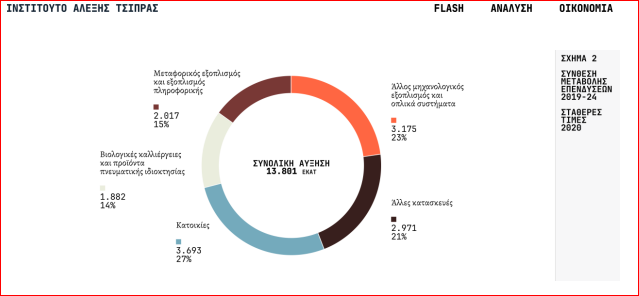 Από τα 3,5 περίπου δισ. ευρώ της συνολικής αύξησης των επενδύσεων, το 87% οφείλεται στις κατοικίες και τις άλλες κατασκευές, ενώ όλες οι υπόλοιπες κατηγορίες, συμπεριλαμβανομένων των οπλικών συστημάτων, περιορίζονται στο 13%.