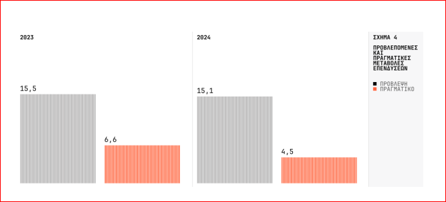 Η διετία 2022-24 δεν αναδεικνύει μόνο την προβληματική σύνθεση των επενδύσεων αλλά και την εντυπωσιακή αστοχία των κυβερνητικών προβλέψεων. Οι προϋπολογισμοί των αντίστοιχων ετών 2023 και 2024, προεξοφλώντας την επίδραση του Ταμείου Ανάκαμψης, προέβλεπαν έντονη αύξηση των επενδύσεων πάνω από 15%. Ωστόσο οι εκτιμήσεις αυτές δεν επιβεβαιώθηκαν. Για την ακρίβεια, η πραγματική αύξηση των επενδύσεων ήταν κοντά στο ένα τρίτο της προβλεπόμενης, διαψεύδοντας την κυβερνητική αισιοδοξία.