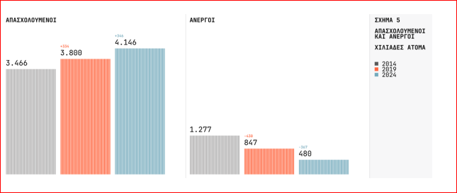 Οι απασχολούμενοι αυξήθηκαν από 3,5 περίπου εκατομμύρια το 2014 σε 3,8 εκατομμύρια το 2019 (+334 χιλιάδες) και σε 4,15 εκατομμύρια το 2024 (+346 χιλιάδες). Παράλληλα, οι άνεργοι μειώθηκαν από σχεδόν 1,3 εκατομμύρια το 2014 σε 847 χιλιάδες το 2019 (-430 χιλιάδες) και σε 480 χιλιάδες το 2024 (-367 χιλιάδες). Οι διαφορές στις επιδόσεις της αγοράς εργασίας μεταξύ των δύο περιόδων δεν είναι δραματικές. Στην περίοδο 2019-24 οι απασχολούμενοι αυξήθηκαν περισσότερο (κατά 12 χιλιάδες) αλλά οι άνεργοι μειώθηκαν λιγότερο (κατά 63 χιλιάδες).