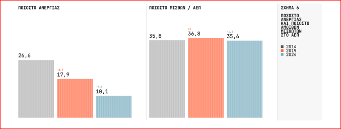 Έντονη διαφοροποίηση μεταξύ των δύο περιόδων καταγράφεται στη διανομή του εθνικού εισοδήματος. Το 2014 οι αμοιβές των μισθωτών ήταν 35,8% του ΑΕΠ και αυξήθηκαν στο 36,8% του ΑΕΠ το 2019 (+1 μονάδα) αλλά το 2024 μειώθηκαν σε 35,6% του ΑΕΠ (-1,2 μονάδες), κάτω από το ποσοστό του 2014. Πρόκειται για μια σημαντική αντιστροφή της τάσης της πρώτης πενταετίας. Πρέπει να διευκρινιστεί ότι σε απόλυτους όρους οι αμοιβές των μισθωτών αυξάνονταν και στις δύο περιόδους. Ωστόσο, σε σχετικούς όρους, αυξάνονταν πιο γρήγορα από το ΑΕΠ στην περίοδο 2014-19 και πιο αργά από το ΑΕΠ στην περίοδο 2019-24.