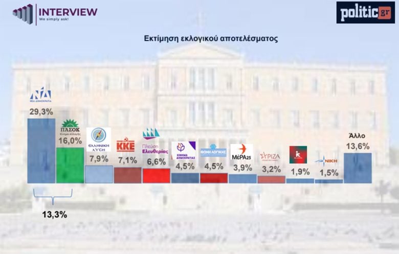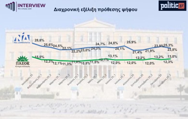 Σύμφωνα με τη νέα έρευνα της Interview για την POLITIC, συγκρίνοντας τα αποτελέσματα με τη μέτρηση του Σεπτεμβρίου, η Νέα Δημοκρατία παραμένει σταθερή στο 23,8% (από 23,9%), το ΠΑΣΟΚ – Κίνημα Αλλαγής στη δεύτερη θέση με 13% (από 13,2%), ενώ η Ελληνική Λύση υποχωρεί στο 6,4% (από 7,5%). Το ΚΚΕ σημειώνει μικρή πτώση στο 5,8% (από 6,1%), ενώ η Πλεύση Ελευθερίας καταγράφει σημαντική μείωση στο 5,4% (από 6,4%), υποδηλώνοντας απώλεια δυναμικής μετά την καλοκαιρινή άνοδό της.
