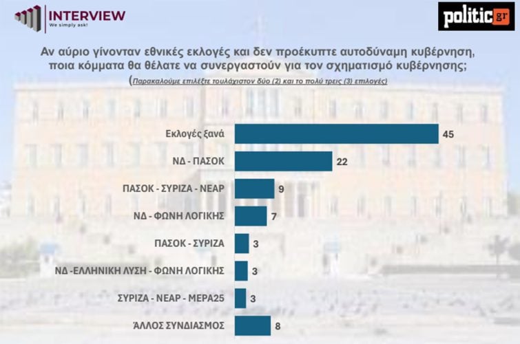 Σε περίπτωση που δεν εξασφαλιστεί αυτοδυναμία, η πλειονότητα των πολιτών φαίνεται να προτιμά την επανάληψη των εκλογών έναντι συνεργασιών κομμάτων. Το 45% των ερωτηθέντων δηλώνει ότι θα προτιμούσε νέες εκλογές, ενώ μόνο το 22% επιλέγει τη συνεργασία ΝΔ – ΠΑΣΟΚ, σενάριο που συγκεντρώνει τη μεγαλύτερη αποδοχή. Ακολουθούν με χαμηλότερα ποσοστά οι συνδυασμοί ΠΑΣΟΚ – ΣΥΡΙΖΑ – Νέα Αριστερά (9%) και ΝΔ – Φωνή Λογικής (7%), ενώ τα σενάρια ΠΑΣΟΚ – ΣΥΡΙΖΑ, ΝΔ – Ελληνική Λύση – Φωνή Λογικής και ΣΥΡΙΖΑ – Νέα Αριστερά – ΜέΡΑ25 συγκεντρώνουν από 3% το καθένα.