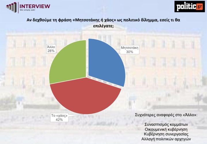 Στο καθιερωμένο πολιτικό δίλημμα «Μητσοτάκης ή χάος», το 42% των ερωτηθέντων απαντά «το χάος», ενώ το 30% επιλέγει τον Κυριάκο Μητσοτάκη και ένα 28% δηλώνει «Άλλο», με συχνές αναφορές σε συνασπισμούς κομμάτων, οικουμενική κυβέρνηση ή αλλαγή πολιτικών αρχηγών. Η υψηλή επιλογή της κατηγορίας «Άλλο» δείχνει ότι η επίκληση του φόβου ή της ανασφάλειας δεν πείθει πλέον την πλειονότητα, καθώς ένα σημαντικό τμήμα των πολιτών αναζητά πιο μετριοπαθείς και διαφορετικές μορφές πολιτικής εκπροσώπησης.