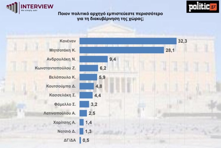 Στην ερώτηση για τον πολιτικό αρχηγό που εμπιστεύονται περισσότερο για τη διακυβέρνηση, προηγείται η απάντηση «Κανένας» με 32,3%, ακολουθούμενη από τον Κυριάκο Μητσοτάκη με 28,1%, τον Νίκο Ανδρουλάκη με 9,4%, τη Ζωή Κωνσταντοπούλου με 6,2%, τον Κυριάκο Βελόπουλο με 5,9% και τον Δημήτρη Κουτσούμπα με 4,8%. Ο Στέφανος Κασσελάκης συγκεντρώνει 4,4%, ενώ η κατάταξη συνεχίζεται με τον Σωκράτη Φάμελλο (3,2%), την Αφροδίτη Λατινοπούλου (2,5%), τον Αλέξη Χαρίτση (1,4%) και τον Δημήτρη Νατσιό (1,3%).