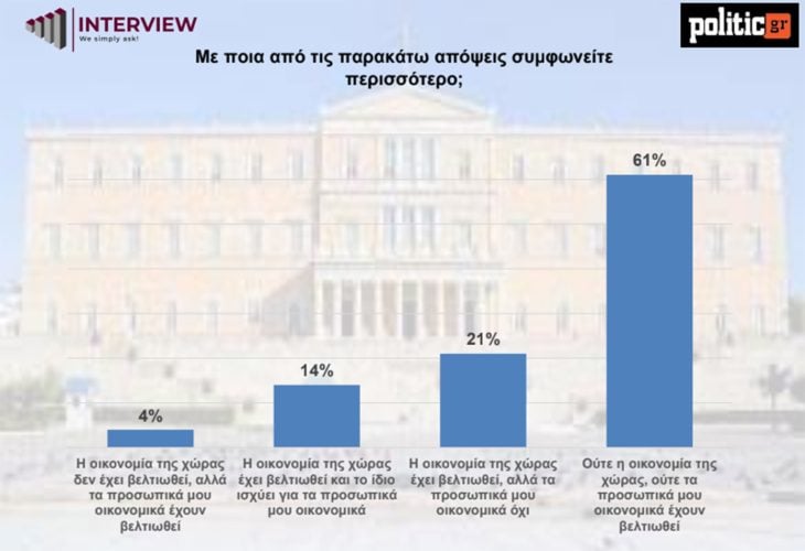 Η οικονομική κατάσταση παραμένει σημαντικό ζήτημα για τους πολίτες, με το 61% να δηλώνει ότι ούτε η οικονομία της χώρας ούτε τα προσωπικά του οικονομικά έχουν βελτιωθεί, ενώ το 21% θεωρεί ότι η οικονομία της χώρας έχει βελτιωθεί, αλλά όχι η προσωπική του κατάσταση. Μόλις το 14% πιστεύει ότι και η οικονομία της χώρας και τα προσωπικά του οικονομικά έχουν βελτιωθεί, ενώ ένα 4% αναφέρει βελτίωση μόνο στα προσωπικά του οικονομικά.