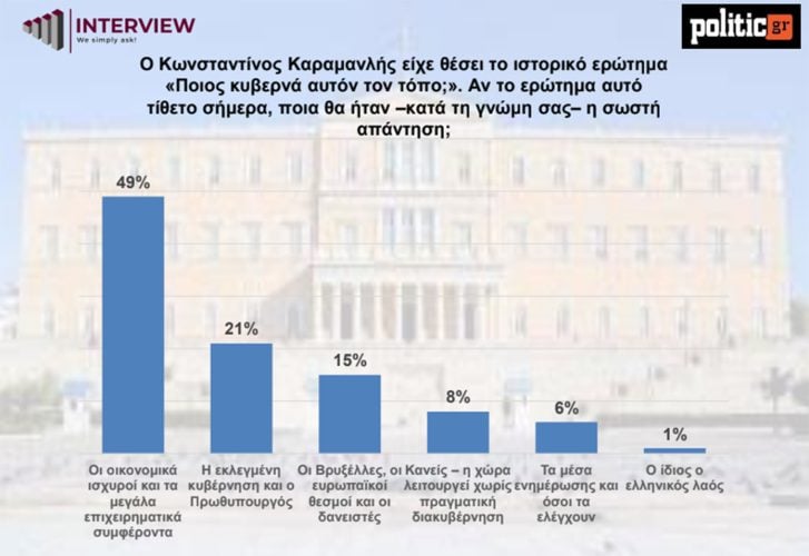 Τέλος, στο ερώτημα «Ποιος κυβερνά αυτόν τον τόπο;», σχεδόν ένας στους δύο πολίτες (49%) θεωρεί ότι κυριαρχούν τα οικονομικά συμφέροντα και οι μεγάλες επιχειρήσεις, το 21% απαντά η εκλεγμένη κυβέρνηση και ο πρωθυπουργός, το 15% αναφέρει τις Βρυξέλλες, τους ευρωπαϊκούς θεσμούς και τους δανειστές, ενώ μόλις 8% πιστεύει ότι η χώρα λειτουργεί χωρίς πραγματική διακυβέρνηση, το 6% καταλογίζει ευθύνη στα μέσα ενημέρωσης και μόνο το 1% εκτιμά ότι κυβερνά ο ελληνικός λαός.