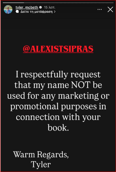 Με ένα story στο instagram, ο Τάιλερ Μακμπέθ απευθύνεται στον Αλέξη Τσίπρα γράφοντάς του: «Ζητώ με σεβασμό το όνομά μου να ΜΗΝ χρησιμοποιείται για οποιονδήποτε σκοπό σκοπό διαφήμισης ή προώθησης σε σχέση με το βιβλίο σας».