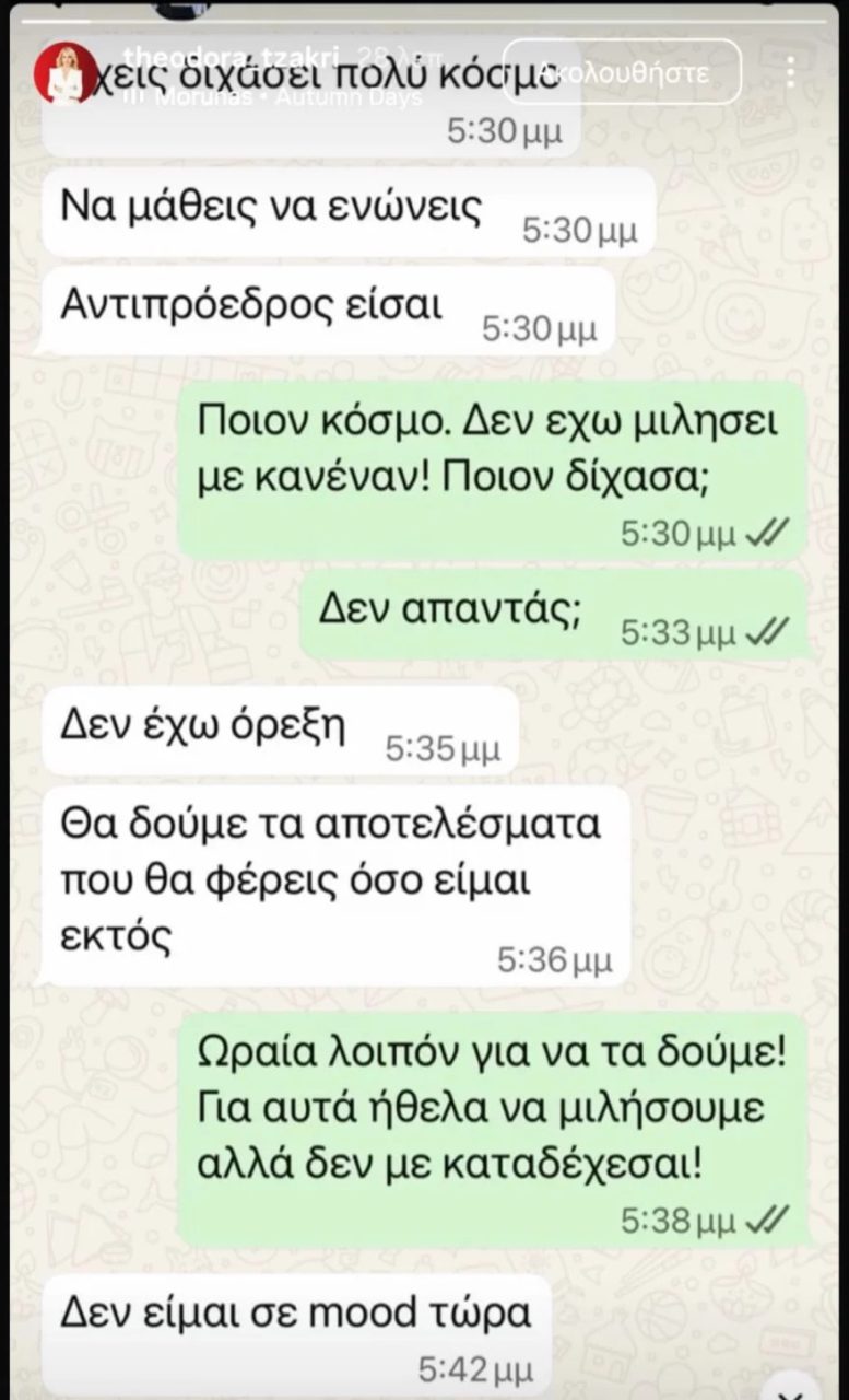 Σύμφωνα με ανάρτηση του γνωστού στιχουργού, Νίκου Μωραΐτη, ο οποίος δημοσίευσε στα κοινωνικά δίκτυα την σχετική συνομιλία, λέγοντας πως η κυρία Τζάκρη «την ανεβάζει καταλάθος στόρι στο ίνσταγκραμ σε δημόσια θέα (έτοιμη για τη Silicon Valley)», τα δυο κορυφαία στελέχη του Κινήματος Δημοκρατίας δεν φαίνεται να διάγουν την καλύτερη περίοδο ως προς τις μεταξύ τους σχέσεις και συνομιλίες.