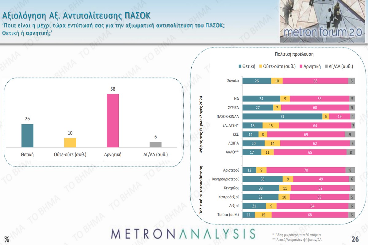 Συνολικά το 26% των ερωτηθέντων θεωρεί θετικό το έργο μέχρι στιγμής το έργο του ΠαΣοΚ ως αντιπολίτευση, ενώ το 58% έχει αρνητική εντύπωση. Στα αξιοσημείωτα το γεγονός ότι η εικόνα του ΠαΣοΚ στην αντιπολίτευση έχει σημαντική αποδοχή μέσα στους ψηφοφόρους της ΝΔ.