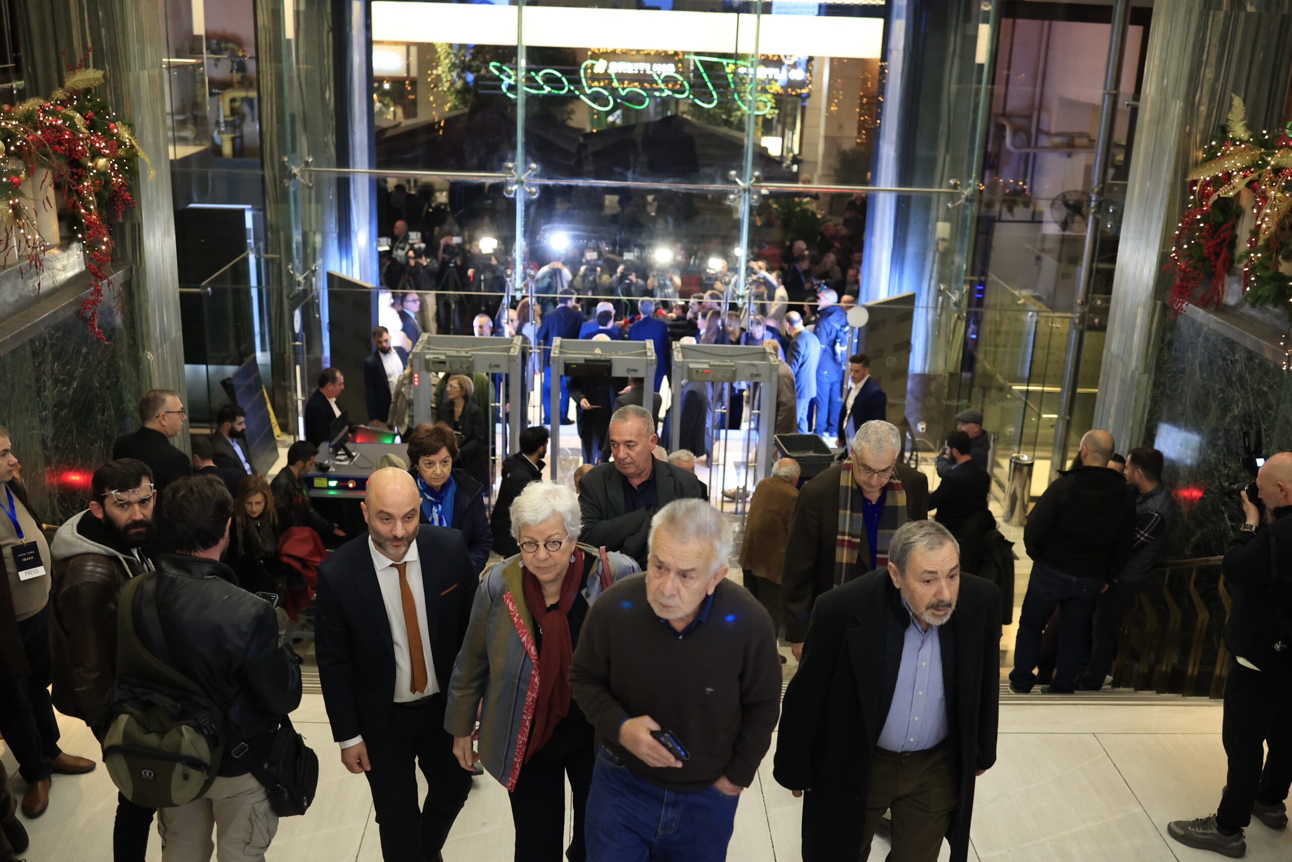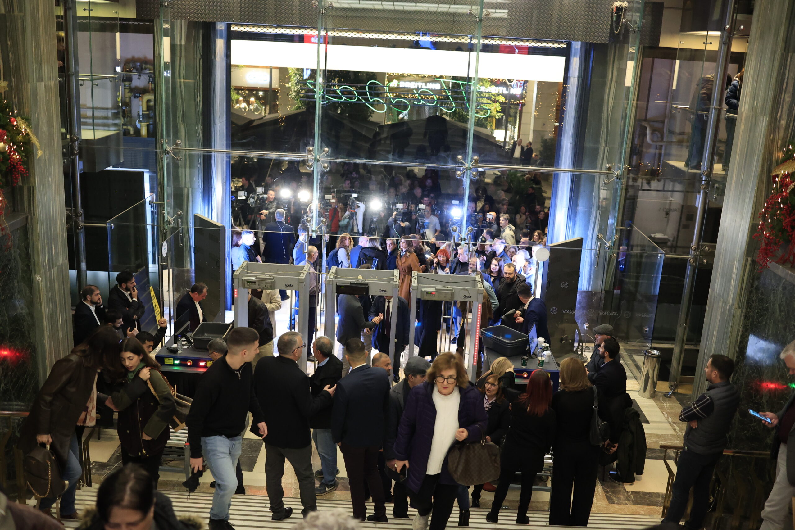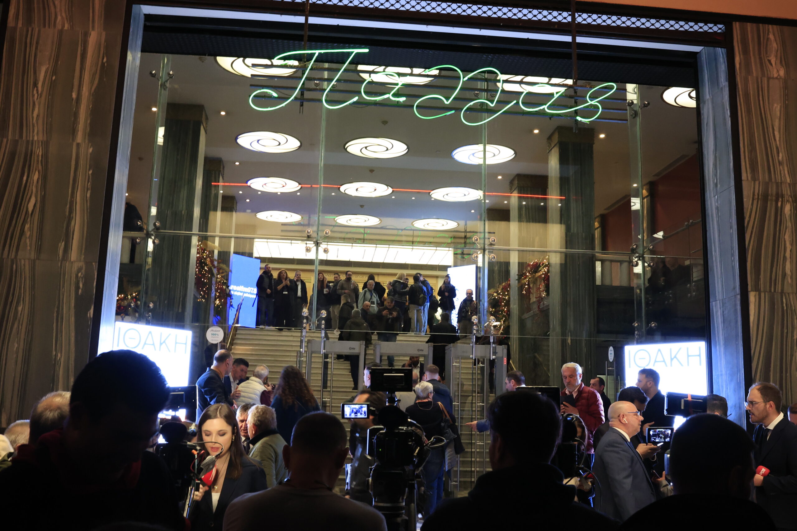 Ιδιαίτερα αυξημένα είναι τα μέτρα ασφαλείας στην είσοδο του θεάτρου Παλλάς, καθώς χιλιάδες κόσμου συγκεντρώνονται για την παρουσίαση του βιβλίου “Ιθάκη”. Δύο ώρες πριν την έναρξη, οι θεατές σχηματίζουν ουρές και στριμώχνονται στα σκαλοπάτια, ενώ τα βιβλία έχουν ήδη στηθεί έξω από την αίθουσα, προετοιμασμένα για το κοινό.