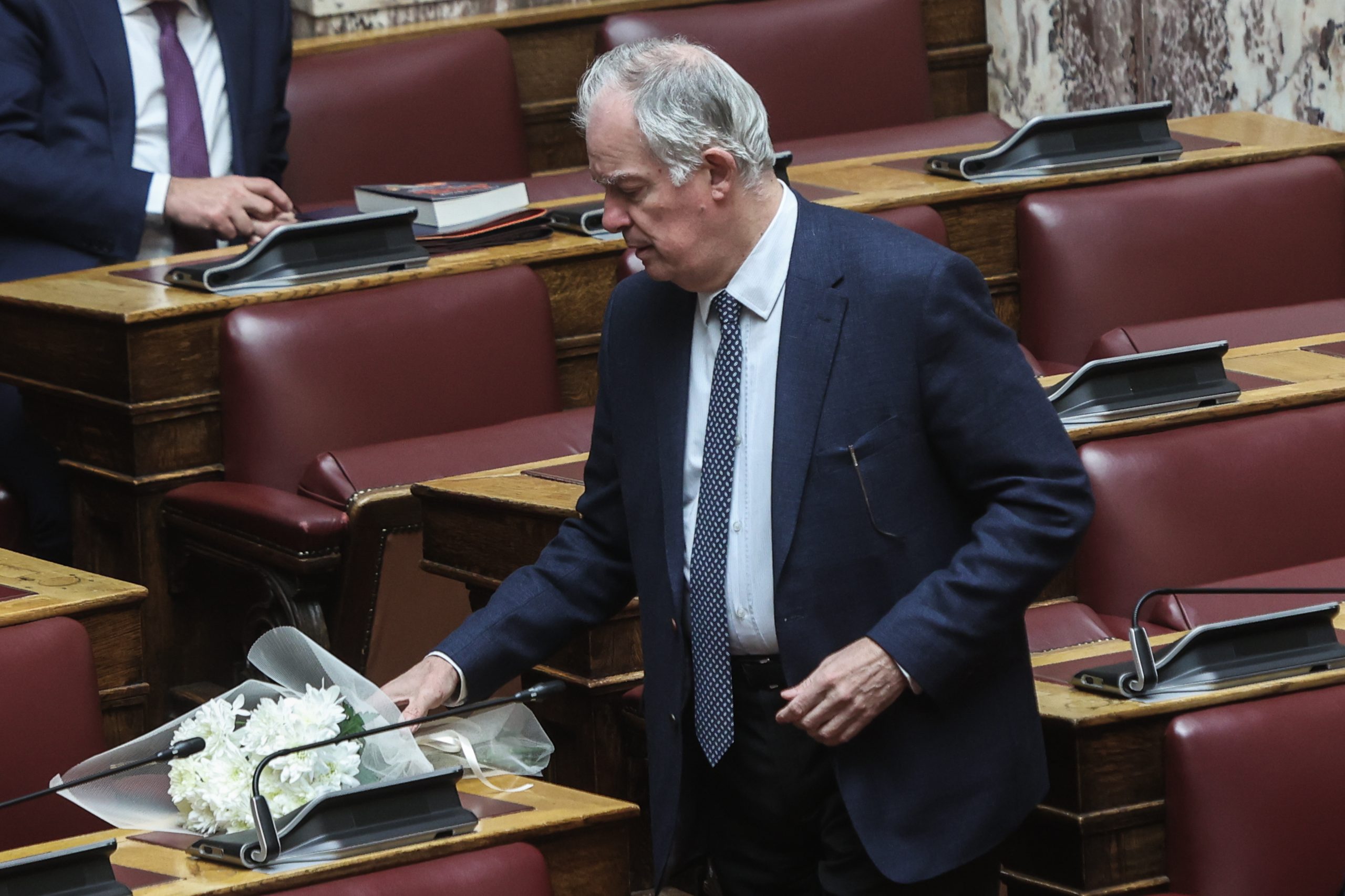 Λουλούδια από τον πρόεδρο της Βουλής Κώστα Τασούλα στα έδρανα για τον θάνατο του βουλευτή Χανιών της Νέας Δημοκρατίας Μανούσου Βολουδάκη