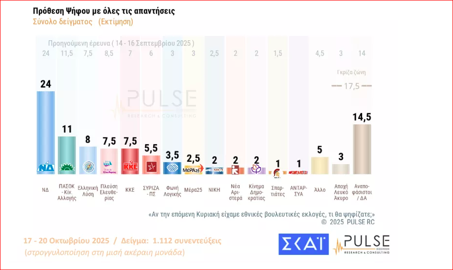 Η νέα καταγράφει σταθερό προβάδισμα της Νέας Δημοκρατίας έναντι της αντιπολίτευσης, με τη ΝΔ στο 29% – 15,5 μονάδες διαφορά από το ΠΑΣΟΚ, το οποίο παραμένει στο 13,5% – «εγκλωβισμένο» σε χαμηλές πτήσεις.
