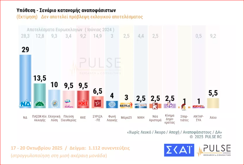 Το κυβερνητικό κόμμα βρίσκεται στο 29%, έναντι 13,5% του ΠΑΣΟΚ, το οποίο παραμένει «εγκλωβισμένο» στις χαμηλές πτήσεις, όντας 15,5 μονάδες πίσω. Ο ΣΥΡΙΖΑ έχει «κατρακυλήσει» στην 6η θέση, ενώ στη Βουλή «μπαίνουν» η Φωνή Λογικής και οριακά το ΜέΡΑ25.