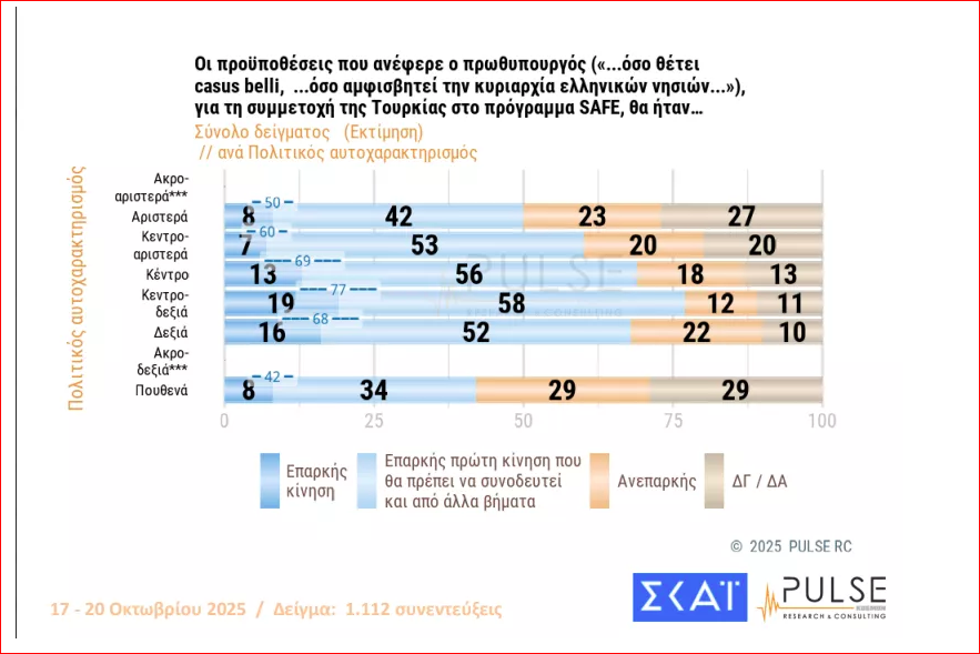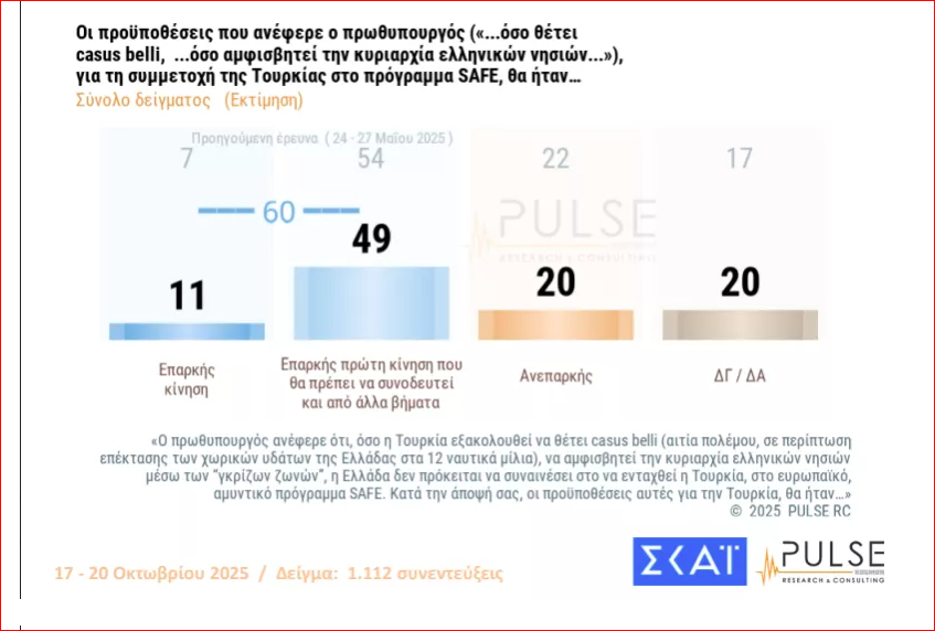 Ελληνοτουρκικά: Το 60% των ερωτηθέντων κρίνει επαρκή την τακτική της κυβέρνησης σχετικά με τους όρους για την άρση του casus belli ενόψει της ένταξης της Τουρκίας στο ευρωπαϊκό πρόγραμμα άμυνας SAFE.