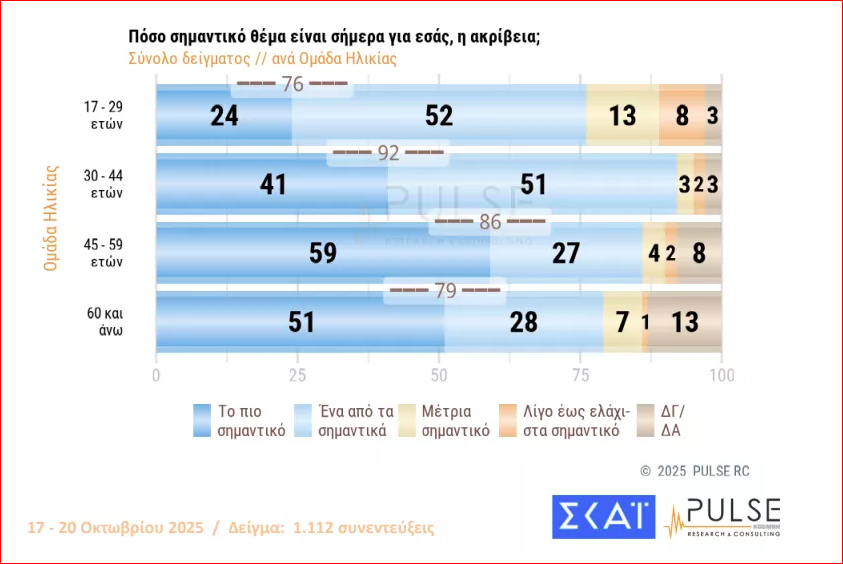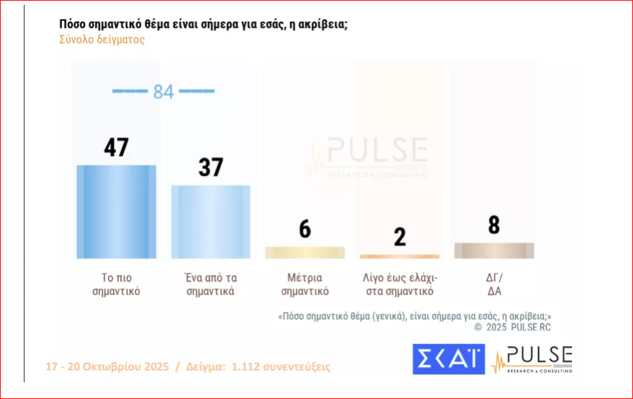 Ακρίβεια: Το 84% των ερωτηθέντων δηλώνει την ακρίβεια και το κόστος ζωής ως το μεγαλύτερο ή ένα από τα σημαντικότερα προβλήματά του, στέλνοντας σαφές μήνυμα στην κυβέρνηση.