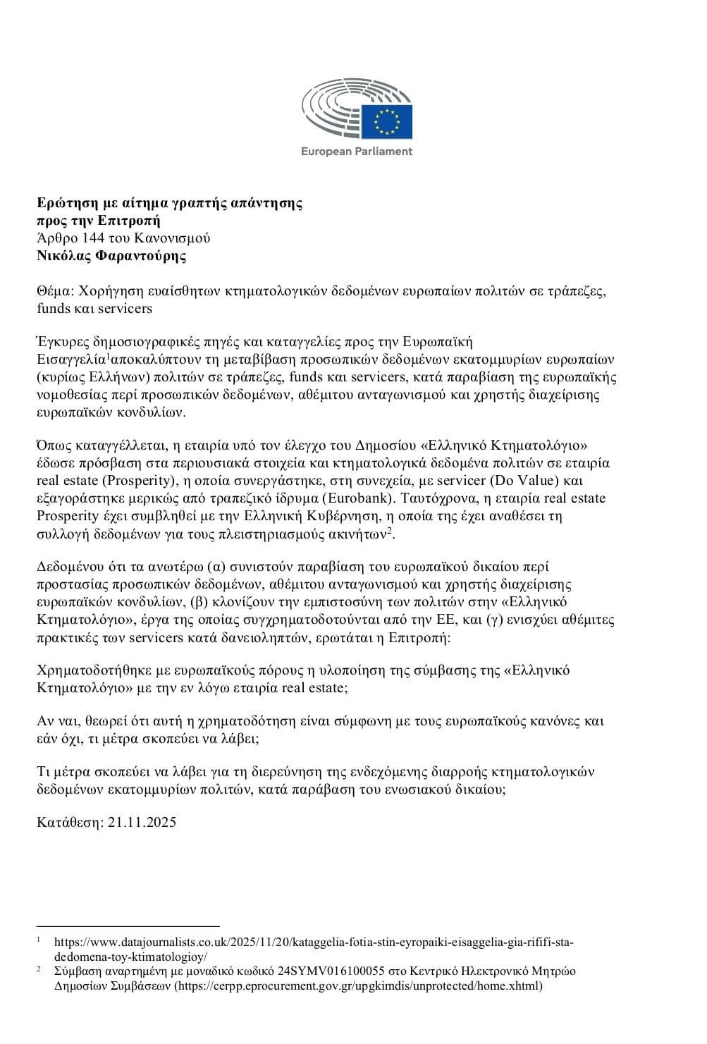 δεδομένων, περί αθέμιτου ανταγωνισμού και της χρηστής διαχείρισης ευρωπαϊκών κονδυλίων, β) κλονίζουν την εμπιστοσύνη των πολιτών στην «Ελληνικό Κτηματολόγιο», έργα της οποίας συγχρηματοδοτούνται από την ΕΕ, και γ) ενισχύουν τις αθέμιτες πρακτικές των servicers κατά δανειοληπτών». Κατόπιν τούτων, ο Έλληνας ευρωβουλευτής ρωτά την Επιτροπή: