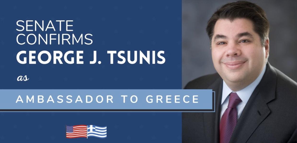Εγκρίθηκε από την ολομέλεια της Γερουσίας ο διορισμός του νέου πρέσβη των ΗΠΑ στην Ελλάδα Τζορτζ Τσούνη. Ο κ. Τσούνης είναι Ελληνοαμερικανός επιχειρηματίας που έχει εκτεταμένη εμπειρία στον κλάδο της τουριστικής βιομηχανίας, καθώς είναι ο ιδρυτής και εκτελεστικός διευθυντής του ξενοδοχειακού ομίλου Chartwell Hotels. Η συγκεκριμένη εταιρία έχει ισχυρή παρουσία σε όλες τις βορειοανατολικές πολιτείες και συνεργάζεται με σημαντικά ονόματα του χώρου όπως η «Hilton», «Marriott» και «Intercontinental».