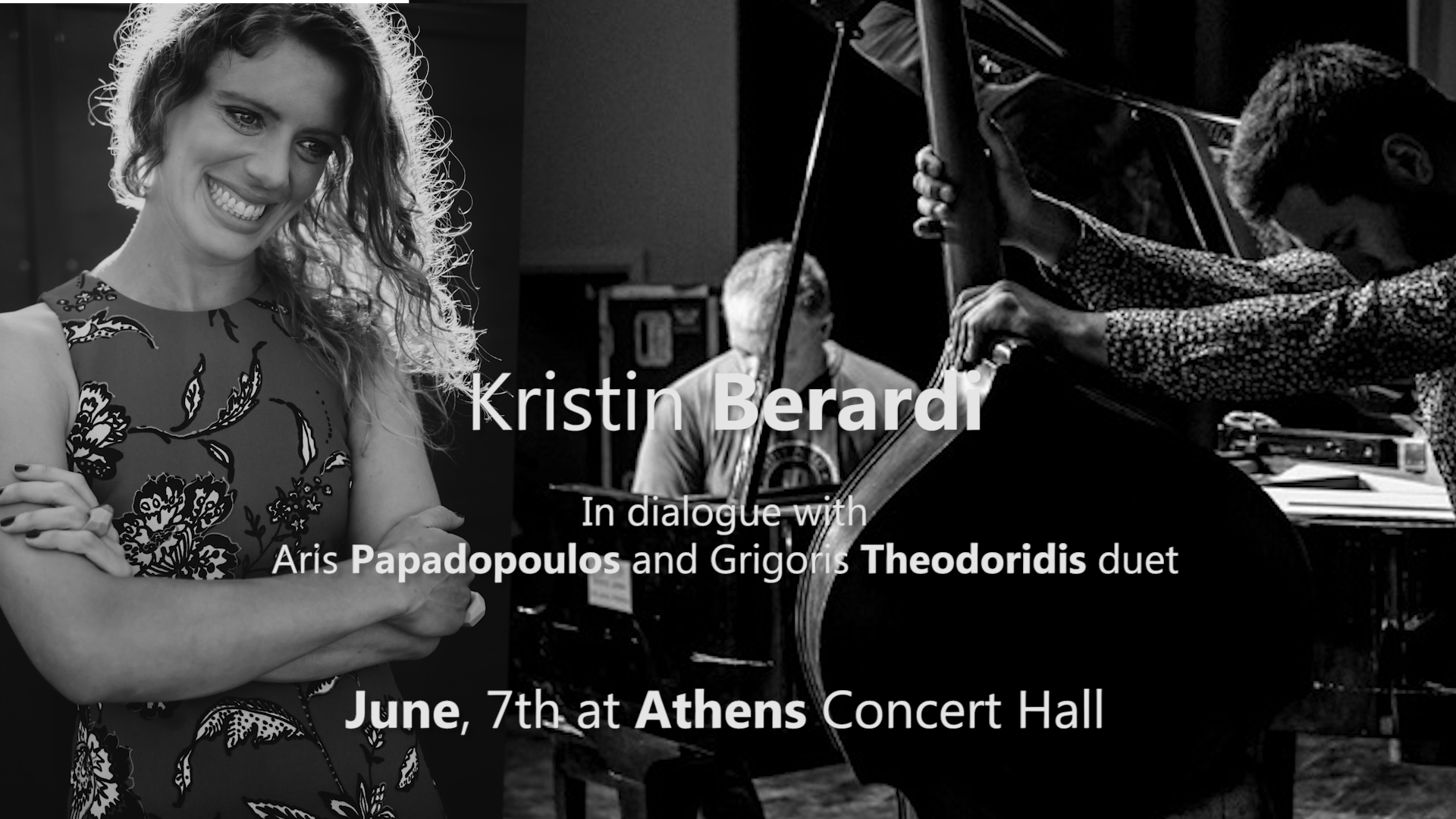 Η πολυβραβευμένη Jazz vocalist Κριστίν Μπεράρντι (Kristin Berardi) έρχεται για πρώτη φορά στην Ελλάδα και συναντά το ντουέτο των Άρη Παπαδόπουλου (πιάνο) και ο Γρηγόρη Θεοδωρίδη (μπάσο) σε μία μοναδική συναυλία στις 7 Ιουνίου στο Μέγαρο Μουσικής Αθηνών.