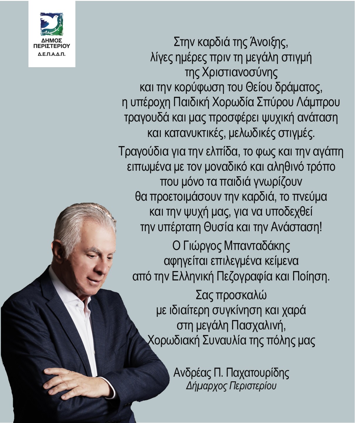 Ο Γιώργος Μπανταδάκης θα είναι ο αφηγητής της ξεχωριστής Πασχαλινής συναυλίας “Ω γλυκύ μου έαρ” που οργάνωσε ο δήμαρχος Περιστερίου Ανδρέας Παχατουρίδης.