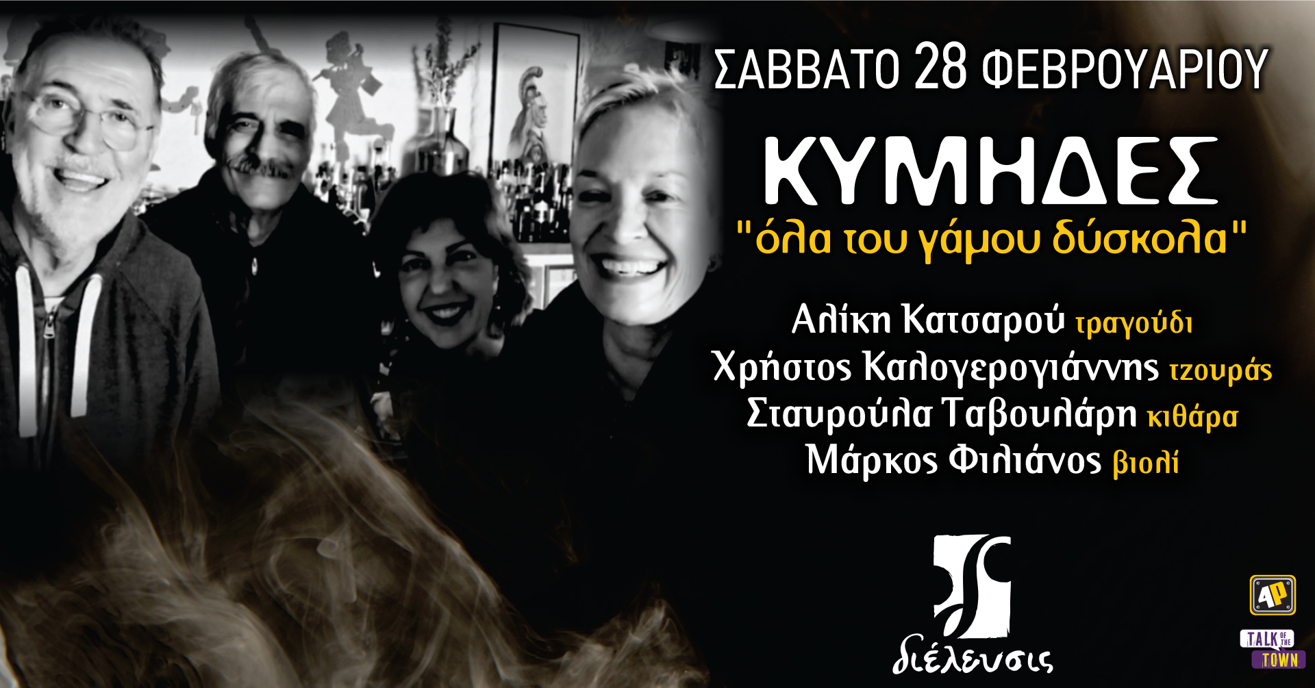 To Σάββατο 28 Φεβρουαρίου υποδεχόμαστε τους Κύμηδες σε μια μουσική διαδρομή με παραδοσιακά, ρεμπέτικα και λαϊκά τραγούδια για τα όμορφα και τα δύσκολα των σχέσεων.