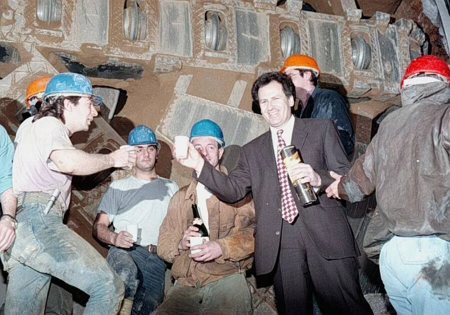 Ο τότε Υπουργός ΠΕΧΩΔΕ Κ.Λαλιώτης μπροστά απο το TBM με τους εργαζόμενους για την κατασκευή του Μετρό. Φωτο: ΑΠΕ/ΜΠΕ