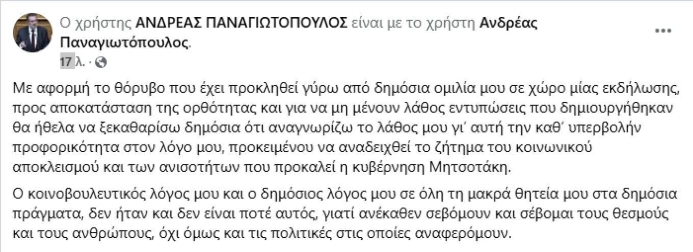 Αναγνωρίζω το λάθος μου, λέει ο Παναγιωτόπουλος του ΣΥΡΙΖΑ μετά τις ύβρεις σε Μητσοτάκη και τις ειρωνείες σε Ανδρουλάκη