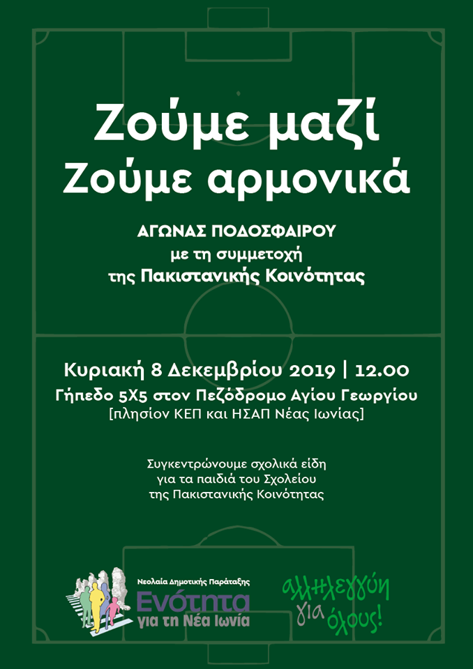 Σήμερα, Κυριακή 8 Δεκεμβρίου, η «Ενότητα για τη Νέα Ιωνία» σε συνεργασία με την «Αλληλεγγύη για Όλους» από τις 12:00 και μετά, στο γήπεδο 5Χ5 του Πεζόδρομου Αγίου ...