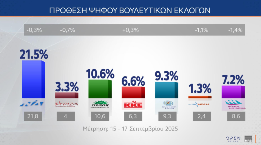 Στην πρόθεση ψήφου, η Νέα Δημοκρατία συγκεντρώνει το 21,5%, έναντι 10,6% του ΠΑΣΟΚ και η Ελληνική Λύση με 9,3% είναι τρίτο κόμμα. Η Πλεύση Ελευθερίας, που χάνει 1,4%, είναι στο 7,2%, μπροστά από το ΚΚΕ (6,6%) και τη Φωνή Λογικής (4%). Στο 3,3% είναι ο ΣΥΡΙΖΑ, που χάνει 0,7%, ενώ η αδιευκρίνιστη ψήφος διαμορφώνεται στο 23,2%.