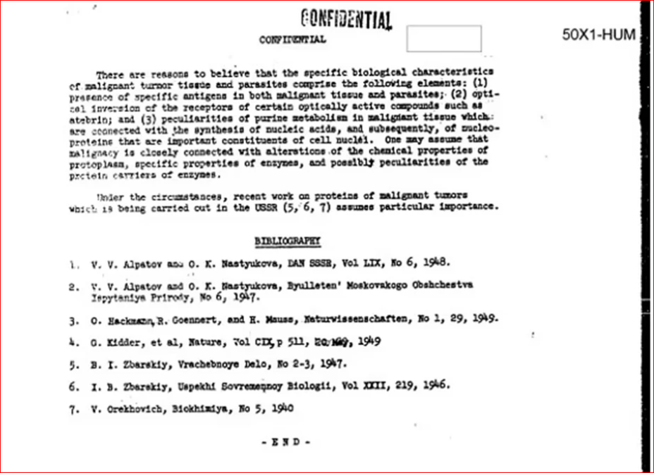 Ένα αποχαρακτηρισμένο έγγραφο της CIA, το οποίο συντάχθηκε τον Φεβρουάριο του 1951 και δημοσιοποιήθηκε το 2014, δείχνει ότι οι αμερικανικές υπηρεσίες πληροφοριών είχαν εξετάσει ήδη πριν από περισσότερα από 60 χρόνια μια σοβιετική επιστημονική μελέτη που υπονοούσε πιθανές νέες προσεγγίσεις για την αντιμετώπιση του καρκίνου. Το έγγραφο συνοψίζει επιστημονική εργασία σοβιετικών ερευνητών, η οποία εξέταζε εντυπωσιακές βιοχημικές ομοιότητες ανάμεσα σε παρασιτικά σκουλήκια και καρκινικούς όγκους.