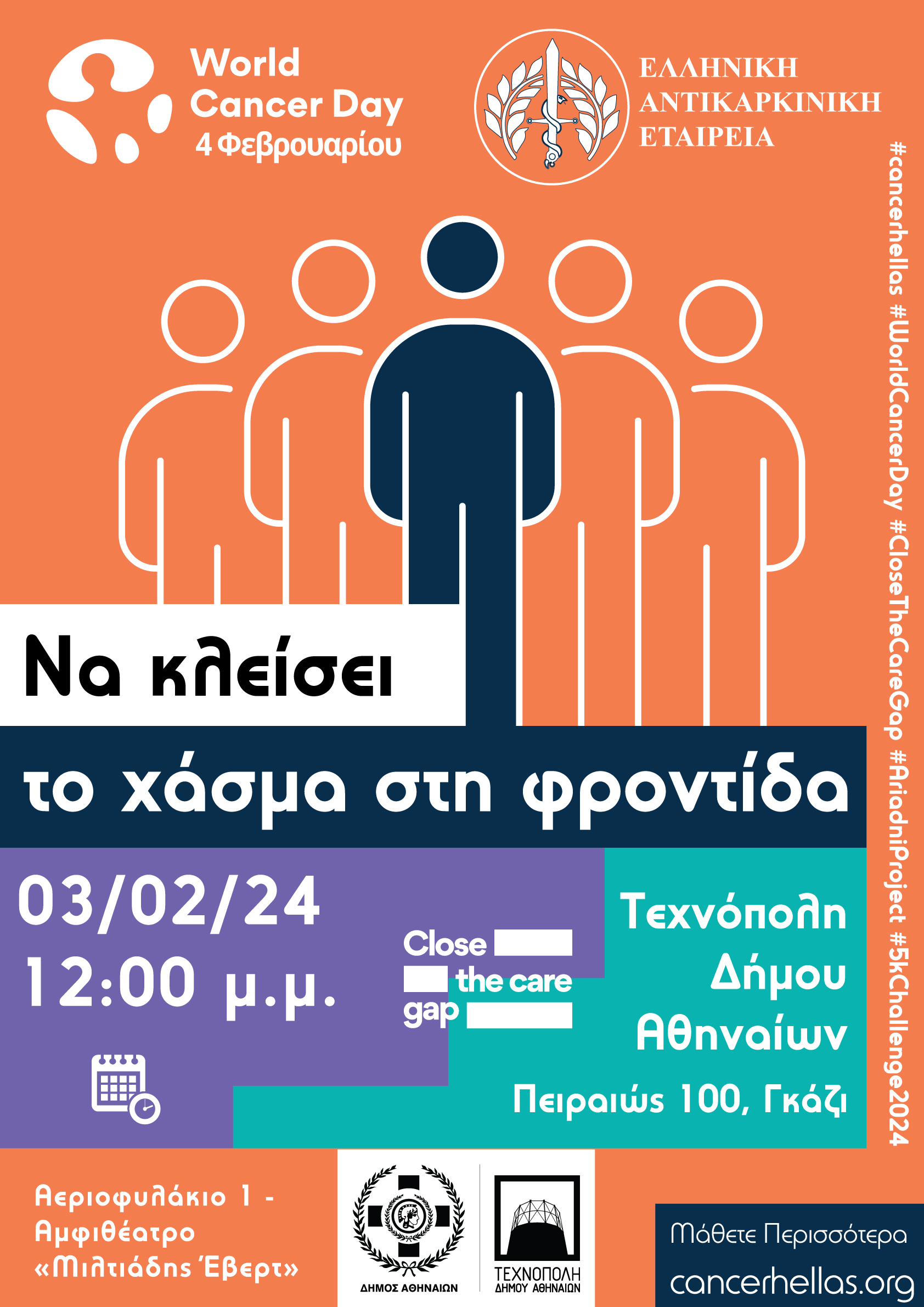 Με αφορμή την Παγκόσμια Ημέρα κατά του Καρκίνου (4η Φεβρουαρίου), η Ελληνική Αντικαρκινική Εταιρεία (Ε.Α.Ε) διοργανώνει εκδήλωση το Σάββατο 3 Φεβρουαρίου 2024 και ώρα 12:00-14:00 στο Αεριοφυλάκιο 1 – Αμφιθέατρο «Μιλτιάδης Έβερτ» στην Τεχνόπολη Δήμου Αθηναίων. Βασικός της στόχος είναι η ευαισθητοποίηση σχετικά με τον κίνδυνο του καρκίνου και τη μείωση των ανισοτήτων για όλους τους ανθρώπους ανεξάρτητα από το ποιοι είναι και πού ζουν. Η εκδήλωση θα περιέχει ομιλίες από διακεκριμένους επιστήμονες, έκθεση φωτογραφίας από τα μέλη του εργαστηρίου του Κ.Η.Π.Ε.Ν μας και μουσική συνοδεία από τη Μικτή Πολυφωνική Χορωδία Δήμου Νέας Ιωνίας.